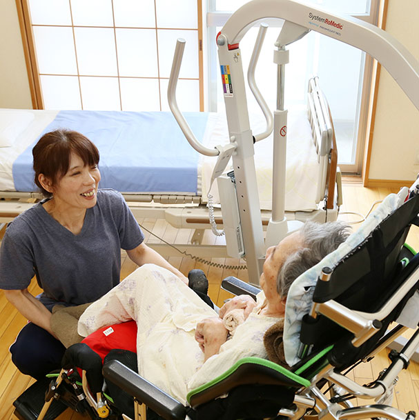 職員と利用者さん双方が【安心・安全・快適】であるように、利用者さんの自立支援をはかりながら福祉機器や福祉用具を活用して職員の腰に負担をかけない介護を行っています。